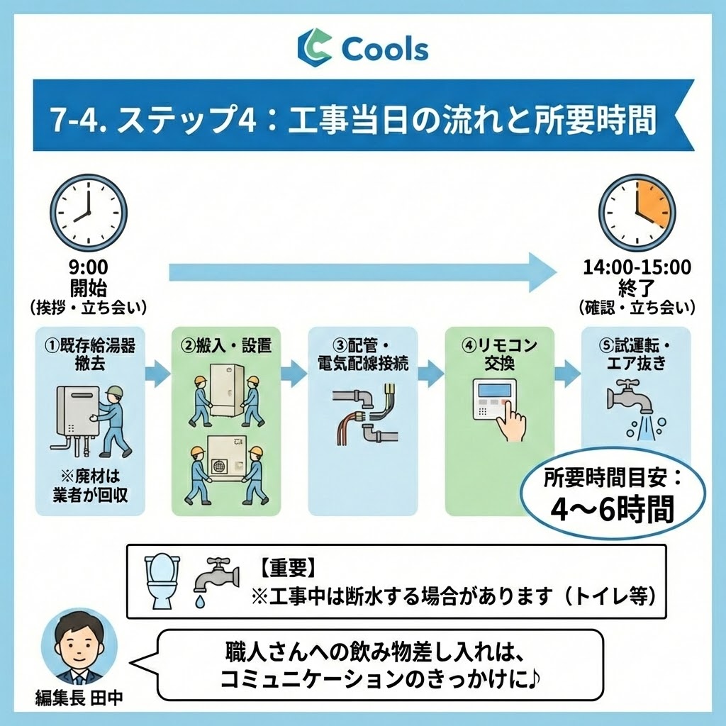 Cools(クールス)でのエコキュート交換工事を失敗なく進めるための5ステップを図解したインフォグラフィック。Step 1のLINE・Webでの3分問い合わせから、Step 2の写真送付と概算見積もり受領、Step 3の正式契約と日程調整(キャンセル規定等の確認)、Step 4の工事当日(4〜6時間、撤去・設置・試運転と立ち会い)、そしてStep 5の試運転・支払い・保証書受け取りまでの一連の流れを、各工程のアイコンと注意点と共に説明。編集長田中によるスムーズな交換のためのアドバイスも掲載。