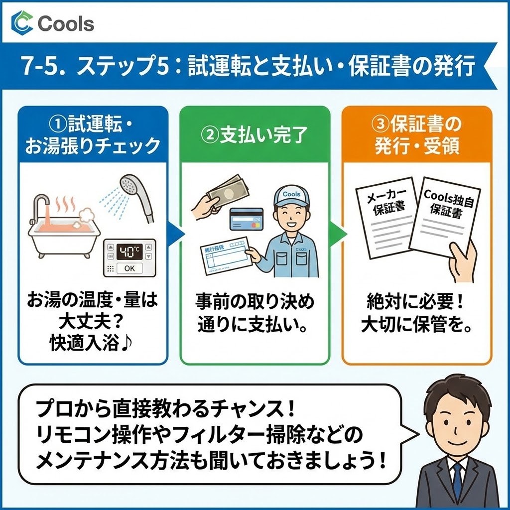 7-5. ステップ5:試運転と支払い・保証書の発行