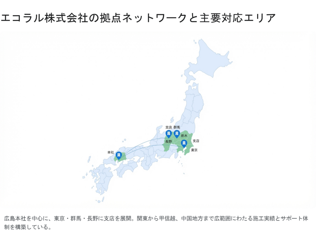 現場の視点から言いますと、拠点が複数あるということは、それだけ広範囲の現場で迅速な対応やアフターサポートが可能だということです。エコラル株式会社の主な対応エリア(施工実績のある地域)は、群馬県、長野県、埼玉県(熊谷市、越谷市など)、東京都、栃木県、茨城県、そして広島県となっています。