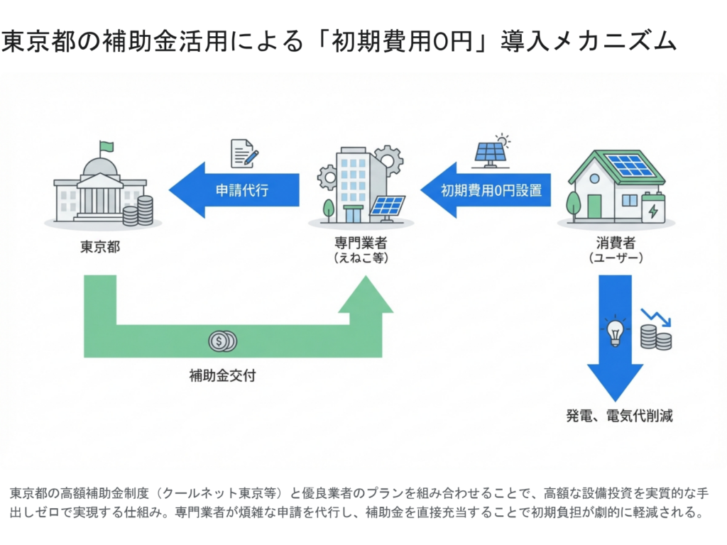 A. はい、現在の東京都(クール・ネット東京)の補助金は全国でも例外的な規模であり、エナジーストーリーの提案する「実質負担の大幅軽減」は、制度をフル活用すれば十分に射程圏内です。この制度は、初期費用をローン等で支払い、後日還付される高額な補助金を一括返済に充てる手法で成立します。