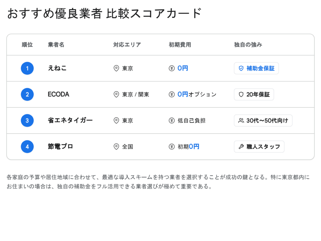 - 補助金は「早い者勝ち」:国や自治体の補助金は、年度ごとに予算上限が定められており、予算額に達し次第、受付が強制的に終了する。特に東京都の補助金は非常に高額で人気が集中するため、検討を始めたら1日でも早く優良業者(えねこ等)に相談し、枠を確保することが極めて重要である。サンドリアも補助金の手続き代行等のサポートを行っていると考えられるが、詳細なノウハウは補助金特化業者に軍配が上がるケースもある。