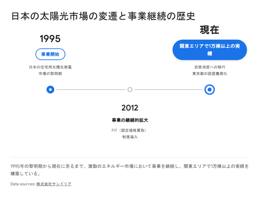 A. 株式会社サンドリアの最大の強みは、1995年という国内における太陽光発電の黎明期から事業を継続している点にあります。設置業者の入れ替わりが激しいこの業界において、30年近い歴史があることは、倒産リスクの低さや長期的な保証の履行能力を裏付ける極めて重要な指標です。