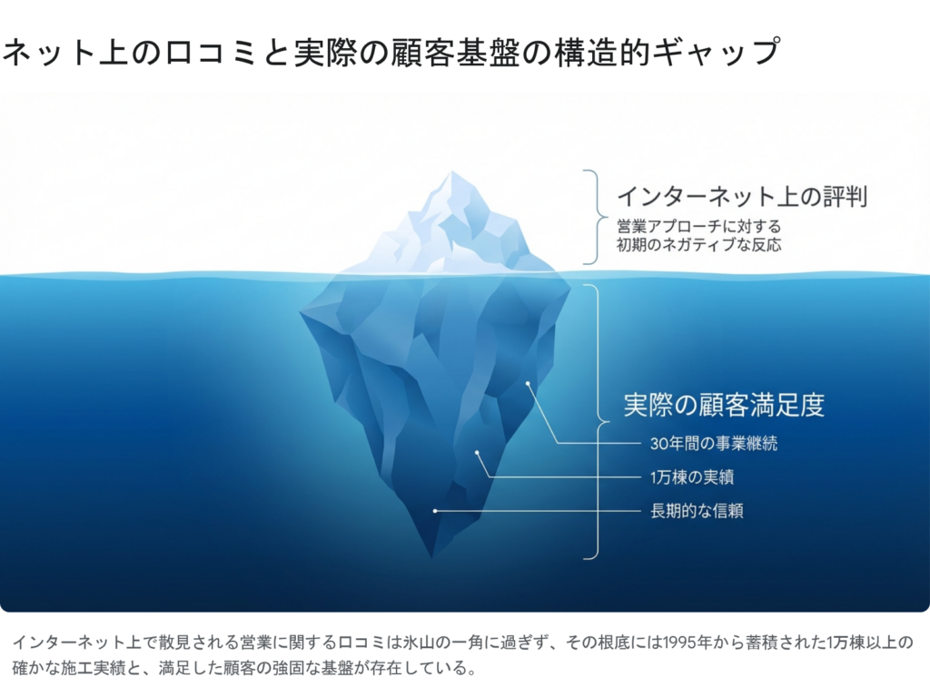 一方で、致命的な施工不良のクレームや、悪徳業者に見られるような強引な押し売りの報告はデータ上確認されていません。