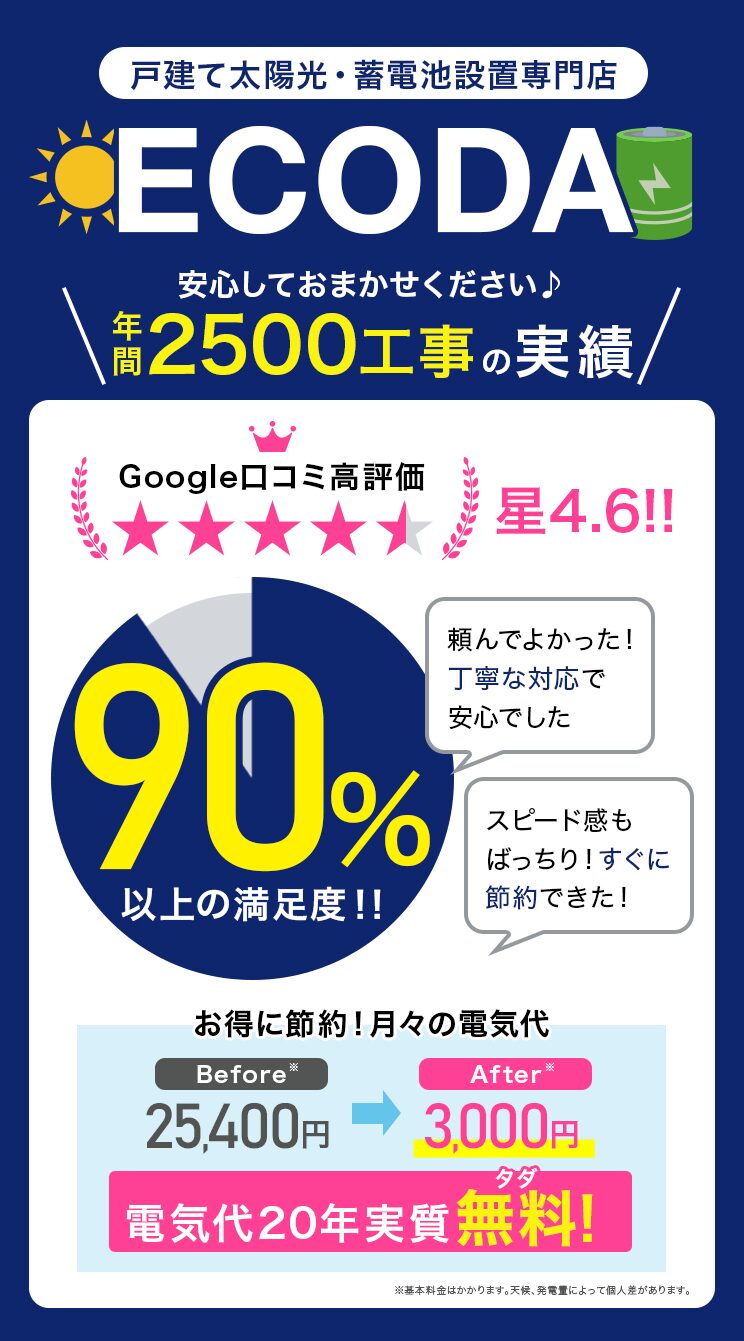 太陽光発電の見積もりを5社ほどして、最後の見積もりしていただいた会社でした。製品の説明がわかりやすいのは当然でしたが、他社と違う観点でのおすすめをしてくださり納得のいく商品を選ぶ事ができました。価格に関しても頑張ってくださって最安値での購入ができました。工事の下見〜施工まで丁寧でその都度の説明もわかりやすく親切です。職人さんも礼儀正しくお隣の方への挨拶もご一緒してくださいました。営業の方にもラインや電話で相談がすぐできて安心です。ECODAさんにお願いしてよかったです。引用元:Googleマイビジネス