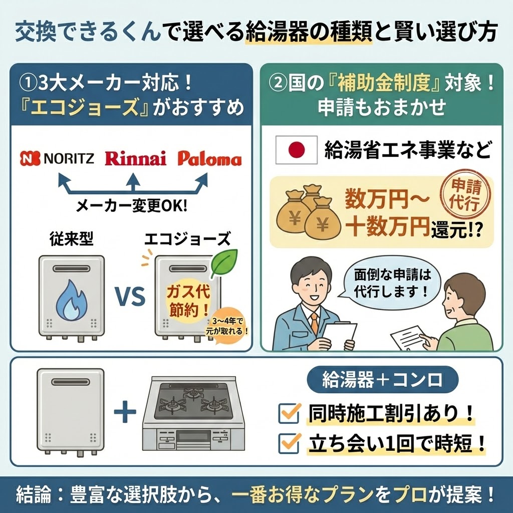 特に「エコジョーズ」や「ハイブリッド給湯器(エコワン)」、「エネファーム」などは補助金の対象になりやすいため、見積もりの際に「補助金を使いたい」と必ず伝えましょう。2026年も新しい制度が始まる可能性がありますが、交換できるくんの公式サイトでは最新の補助金情報が随時更新されています。